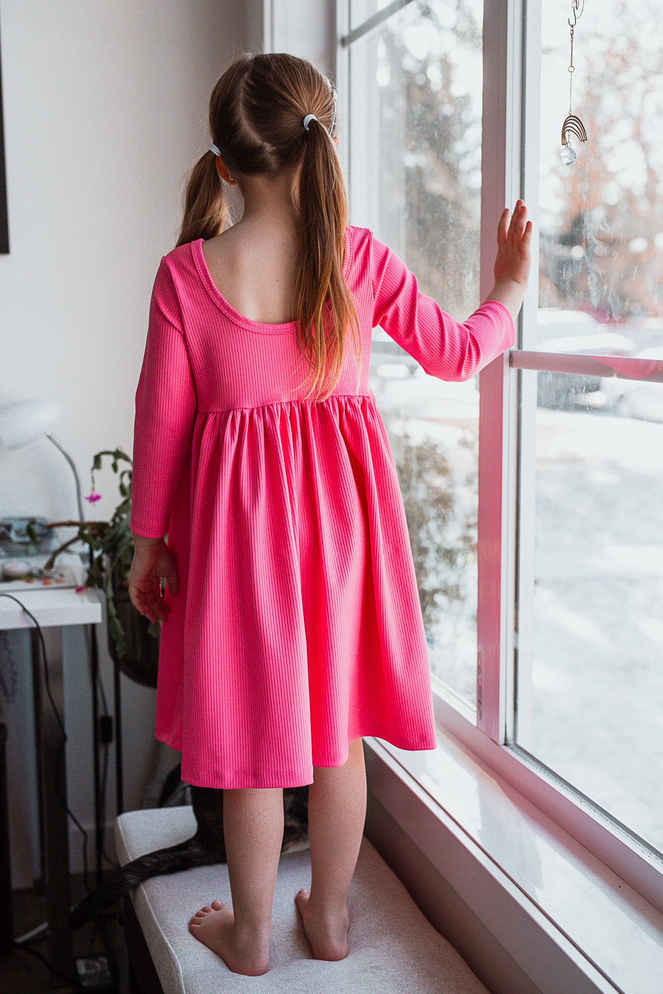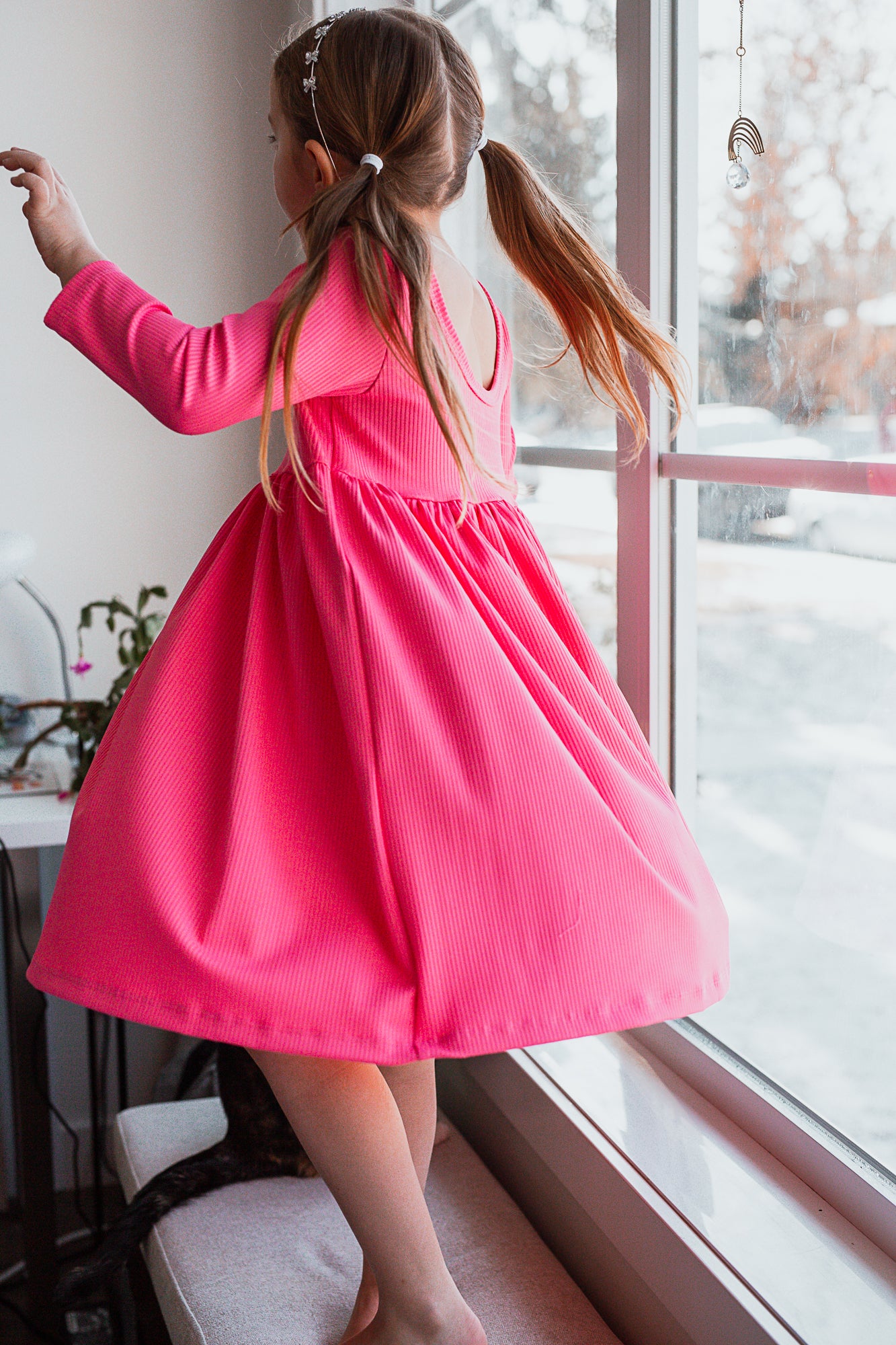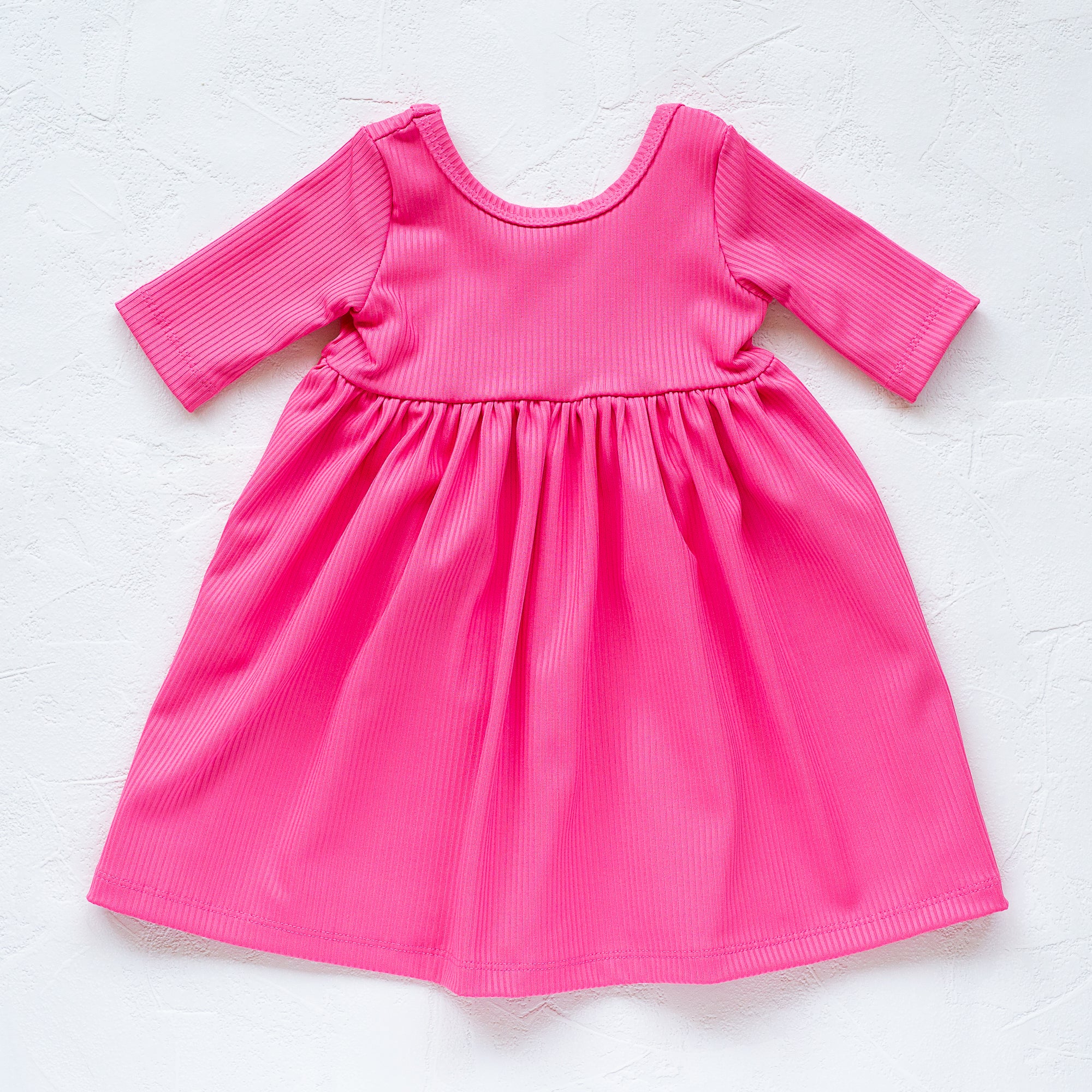 Using our classic dress pattern, this dress is designed with an empire bodice and a gathered skirt, creating a twirl-worthy silhouette that little dancers will love. This dress has 3/4 length sleeves and a scoop-back neckline, perfect for cooler days.